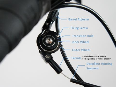 The Tanpan can be mounted at the rear derailleur or inline near the shifters. The Tanpan is mounted between the rear derailleur and the end of the cable housing, when the cable is not internally routed and the cable housing has sufficient free length to accommodate the Tanpan without tight bends. The Tanpan is mounted using the Inline Adapter up front near the shifters inline between two parts of housing, generally for bikes with internal cable routing.