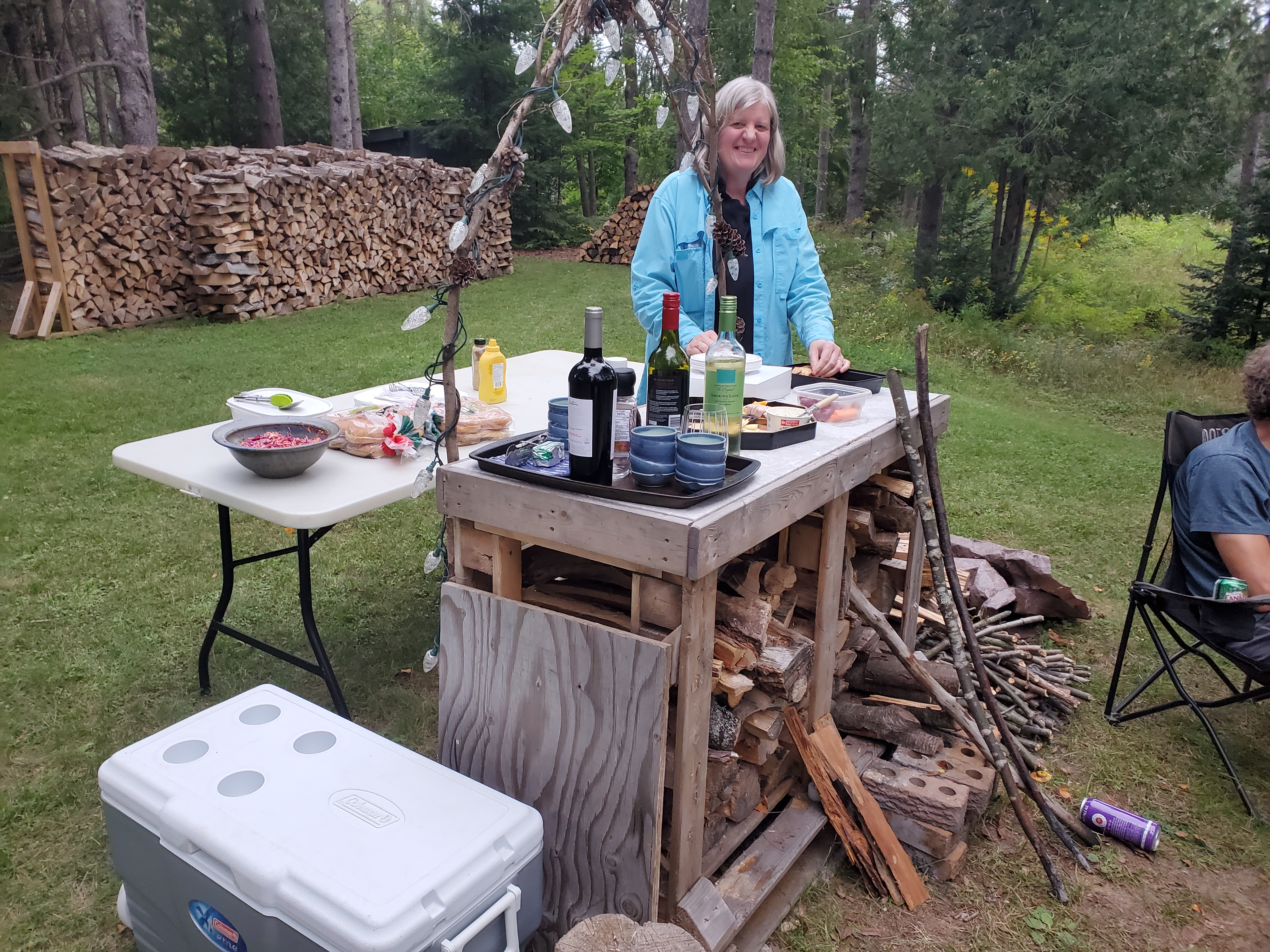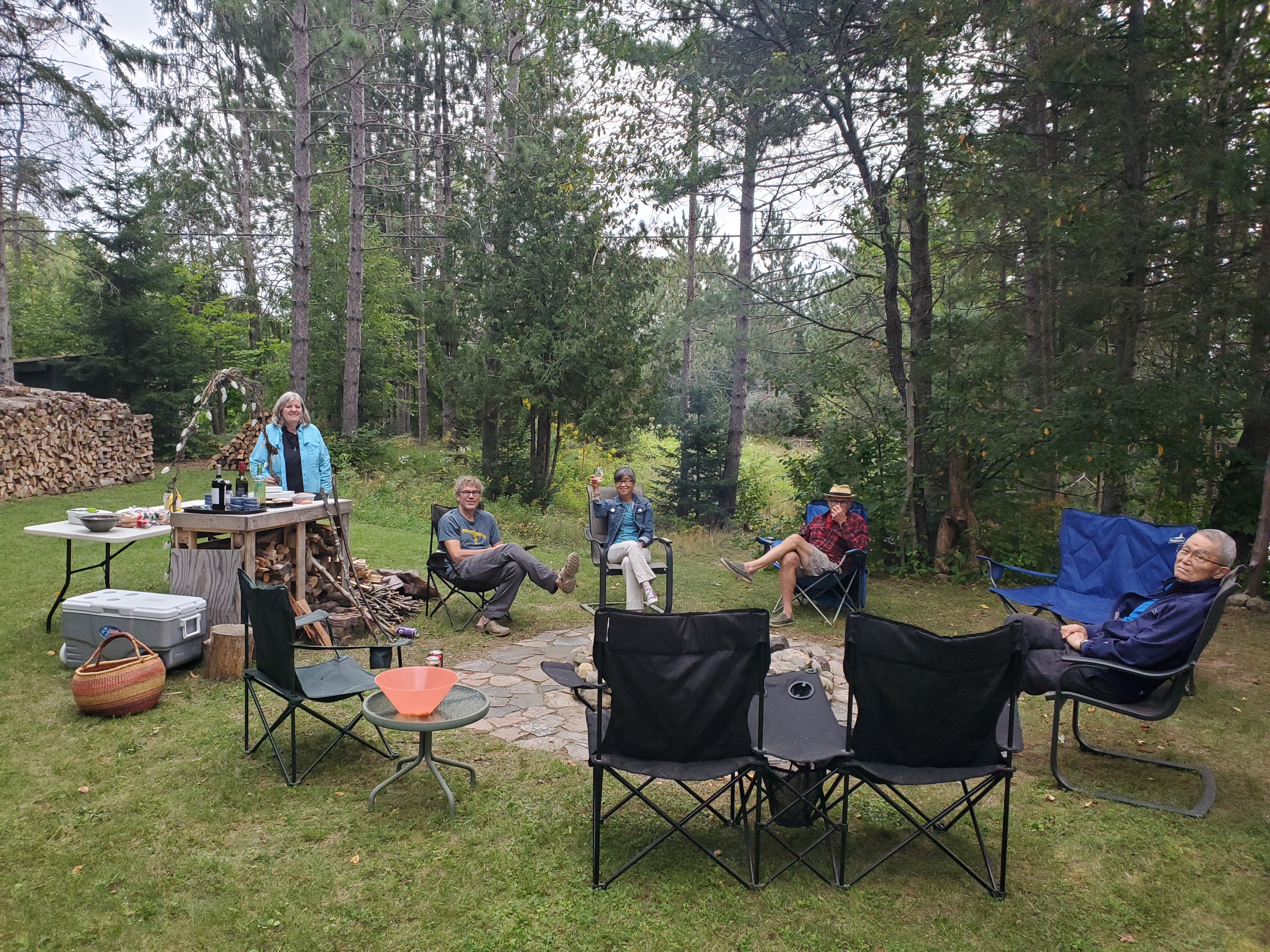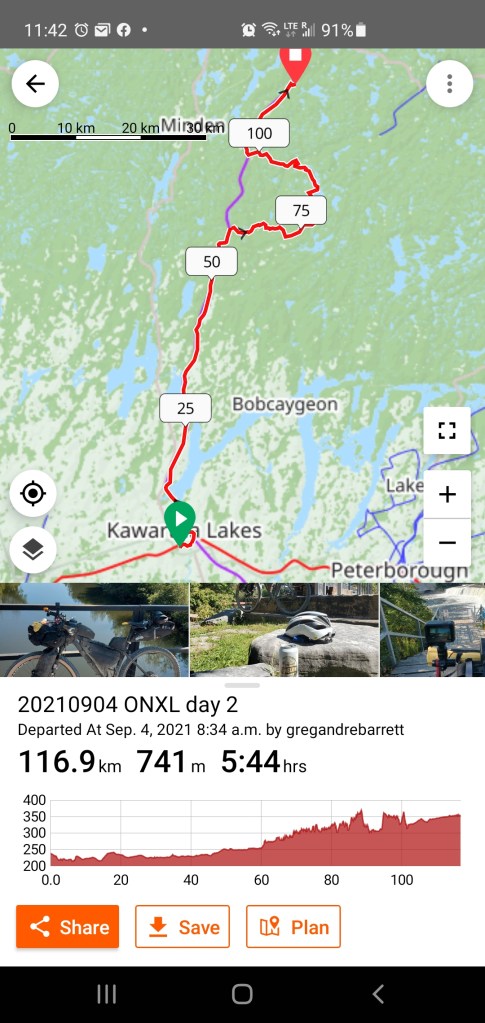Only 117 km today from Lindsay to Greg and Joy Shikaze’s home just south of Haliburton, where my bike buddy Hal Judd joins me on this ride. Lots of hills to climb and really sandy rail trail to plow through. Then Greg and Joy served up an amazing 5 star gourmet meal outside around their firepit with beer, wine and whisky.