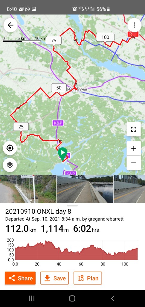 The ride today from Calabogie ON to Shawville QC, was only 112k, with 1,114m of climbing. This was because my severe shoulder pain necessitated stopping at a pharmacy in Renfrew for almost three hours to get some prescription strength Diclofenac 5% nonsteroidal anti-inflammatory (double the strength of Voltaren extra strength that I had been using). I was lucky to be able to contact and get my doctor to fax the prescription to the pharmacy and for them to make it up so quickly. With the Diclofenac 5% the second part of today’s ride was about half as painful.