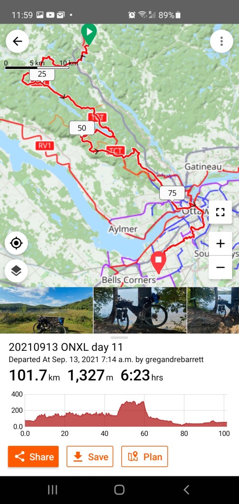 Wakefield to Ottawa 102k and 1,327m of climbing. Despite being the shortest distance, today’s ride was the toughest because: my shoulder was very painful, there was probably the largest portion of rough tough mountain bike trails and there were some really steep and very long climbs on the rough mtb trails (see the photo with the elevation profile).