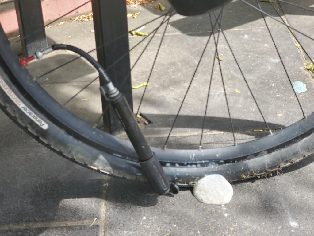 In the morning I went into a pothole that punctured my tire. The puncture was small but the tubeless tire sealant would not seal the hole. I eventually put a Stan’s plug in the hole and put a 2 ounce bottle of Stan’s sealant in as well. It stopped the leak and held for the rest of the day! But I did lose an hour.