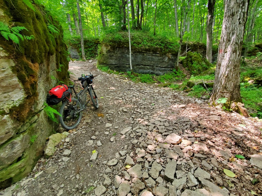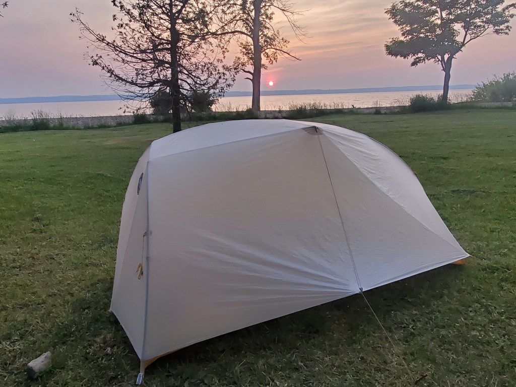 Today rode 167k to reach 347k of the 800k route. Today was rougher trail and tougher climbs. Free wild camping in Ainsley Conservation Area on Georgian Bay. Beautiful sunset tonight.