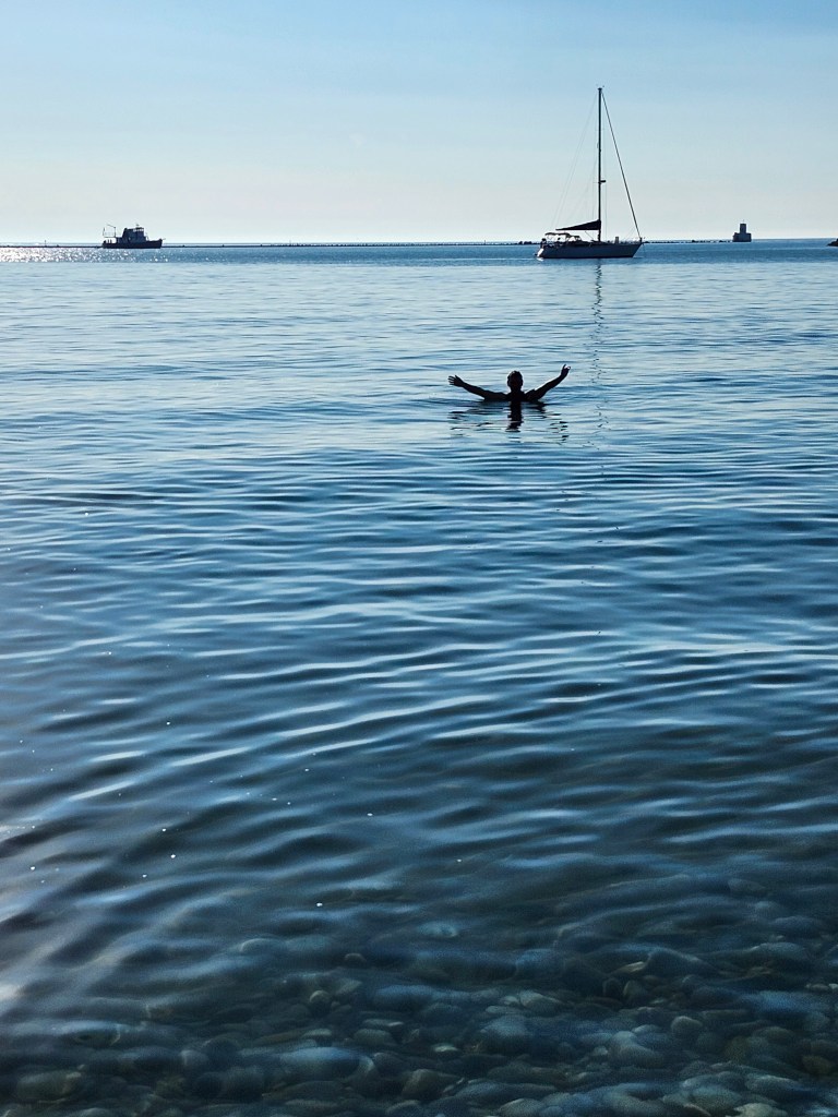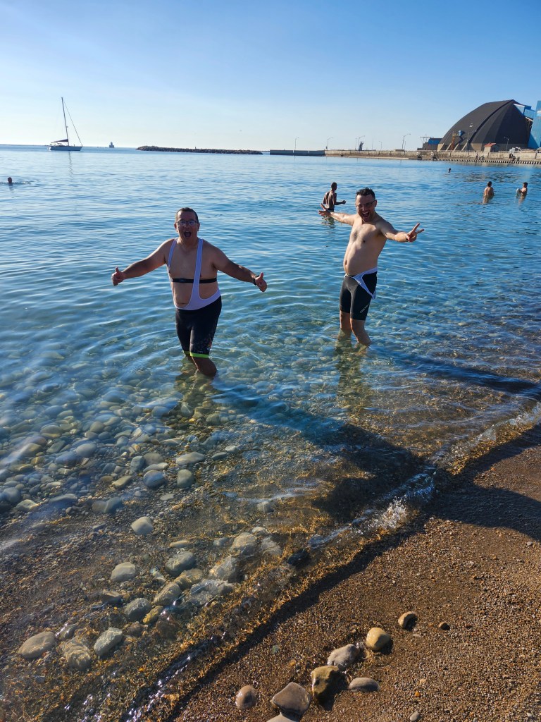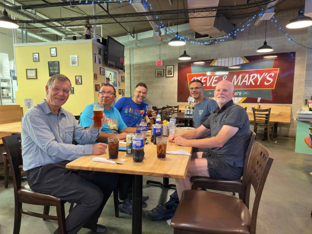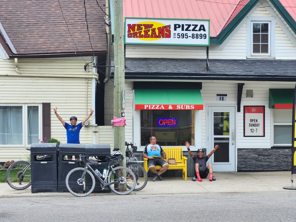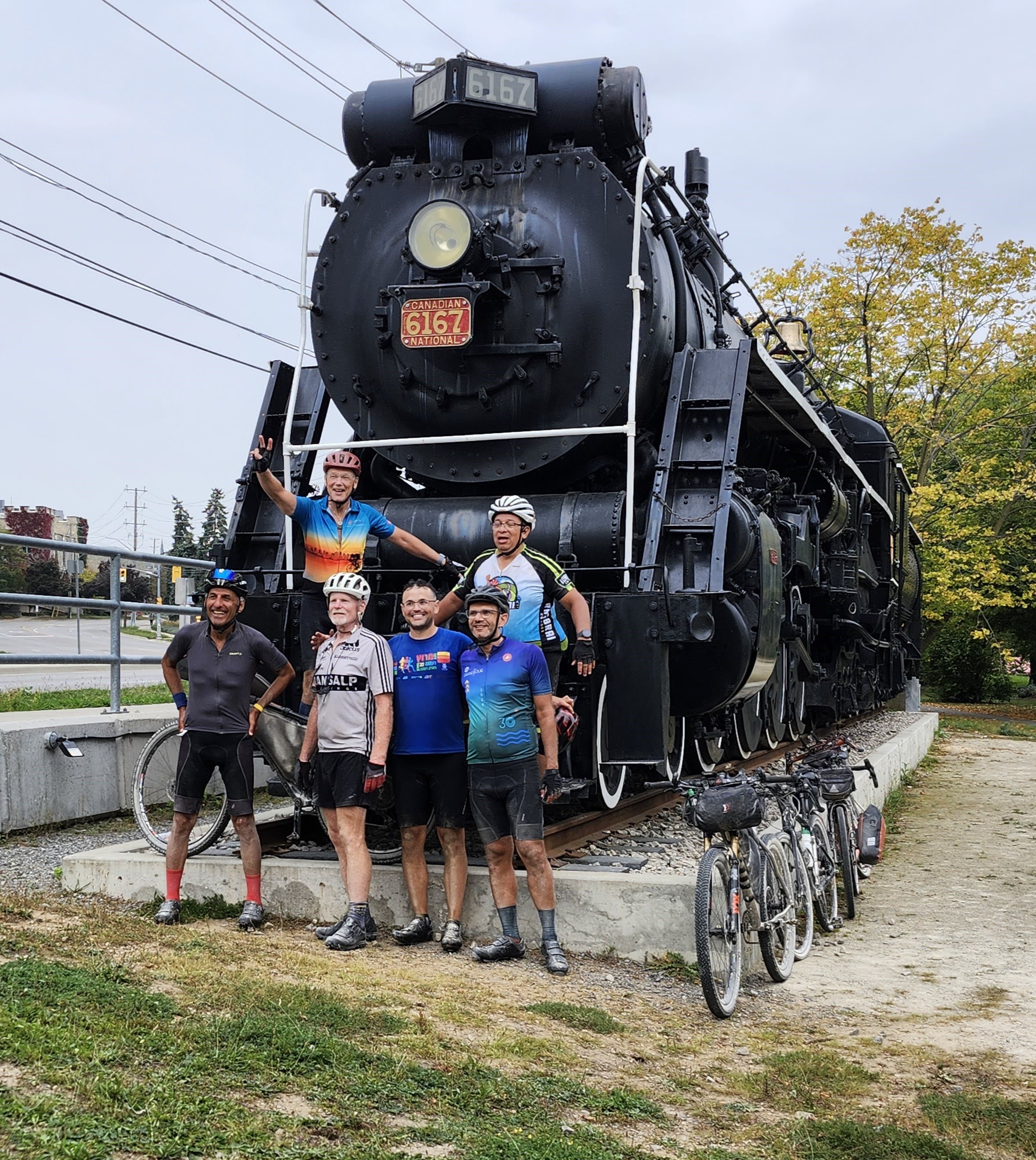 Friday night Greg Andre-Barrett drove Ari Caylakyan , Italo Bravo , and Yaniv Leichtmann to Guelph, had dinner at Buan Gusto (tasty but some complaints about small portions), met Greg’s friend Ken Waring (TBN guest), and stayed in a large house rented on Booking.com. Saturday we parked downtown in the East Parkade, where Kourosh Alasvand joined us. About 7am we started G2G westward to Goderich. At km 3 we had breakfast at Tim’s. The rest of our 142 km trip was almost entirely on hard packed gravel rail trail, through bucolic farm land, with perfect weather, at km 22 the West Montrose Covered Bridge, at km 53 Anna Mae’s Bakery for tasty snacks, at km 109 tasty beer and lunch at Cowbell Brewery, at km 122 a cool fording of the Maitland River, at the end at km 140 a refreshing swim in Lake Huron to wash off the trail’s white dust that coated everything, discovering that Aris’s tubeless tire had a slow leak but looked like the sealant had plugged it, having a tasty refueling meal at Steve and Mary’s (with appropriately a toy train running on track above us), having Terry Walsh join us in Goderich for the ride back tomorrow, and finally a well earned sleep at Bedford Hotel. (Note: After these day 1 photos is day 2)