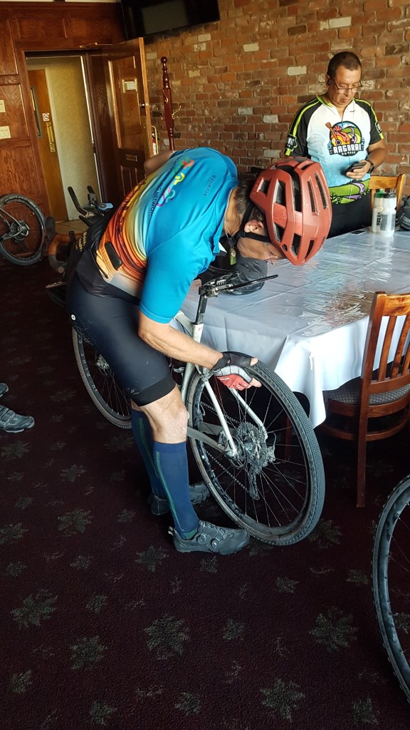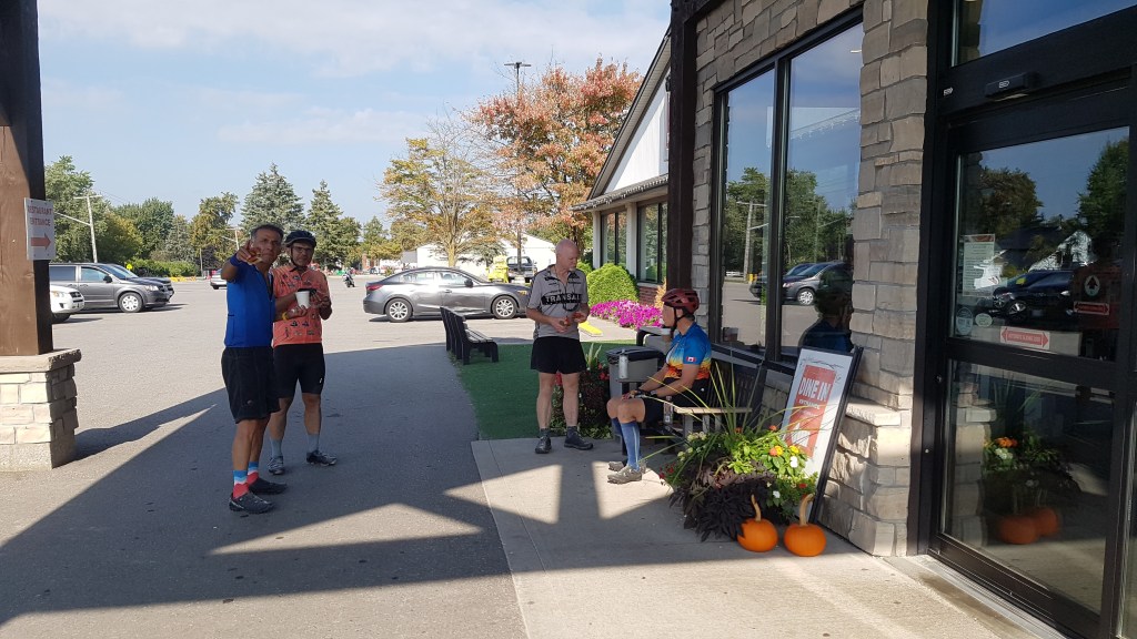 Sunday morning at 6am the room with our bikes was still locked. So we walked to Tim’s for breakfast. When we got back the room was unlocked. Ari’s tire seemed to be holding air. About 7am we started our 142 km trip back to Guelph. Just outside Guelph Ari’s tubeless tire went flat. So we cleaned out most of the messy sealant and put in a tube. Instead of fording the Maitland River we went north and crossed on the Auburn bridge. In Blyth Ari’s tire went flat again. This time we did a thorough inspection of the tire and discovered about a 10mm slice. We put in a new tube with a tire boot patch between the tube and the slice in the tire. No problems after that. At km 81 we stopped in Milverton for lunch at New Orleans Pizza and Milverton Mini Mart (sandwiches and great ice cream). At km 83 everyone rode the rocky gully trail (where last year Italo broke his lever-brake lever). At km 113 practically on the trail in Elmire we stopped for a late lunch at Fry Days, so small that we almost missed it, but real tasty food and fresh squeezed lemonade. With some energizing food and drink in our bellies, we told our tired legs to shut up and just pedal the rest of the way back to Guelph and the Locomotive. We agreed (especially those roadies new to gravel) that gravel trail riding is 20-25% harder than road. The second day was tougher as we were tired and the G2G eastward for about 90k is mostly uphill at a steady 1-2%, which is much harder than it sounds. But everyone kept up a pretty good average pace as Saturday was 20.9kph and Sunday was close at 20.1kph.